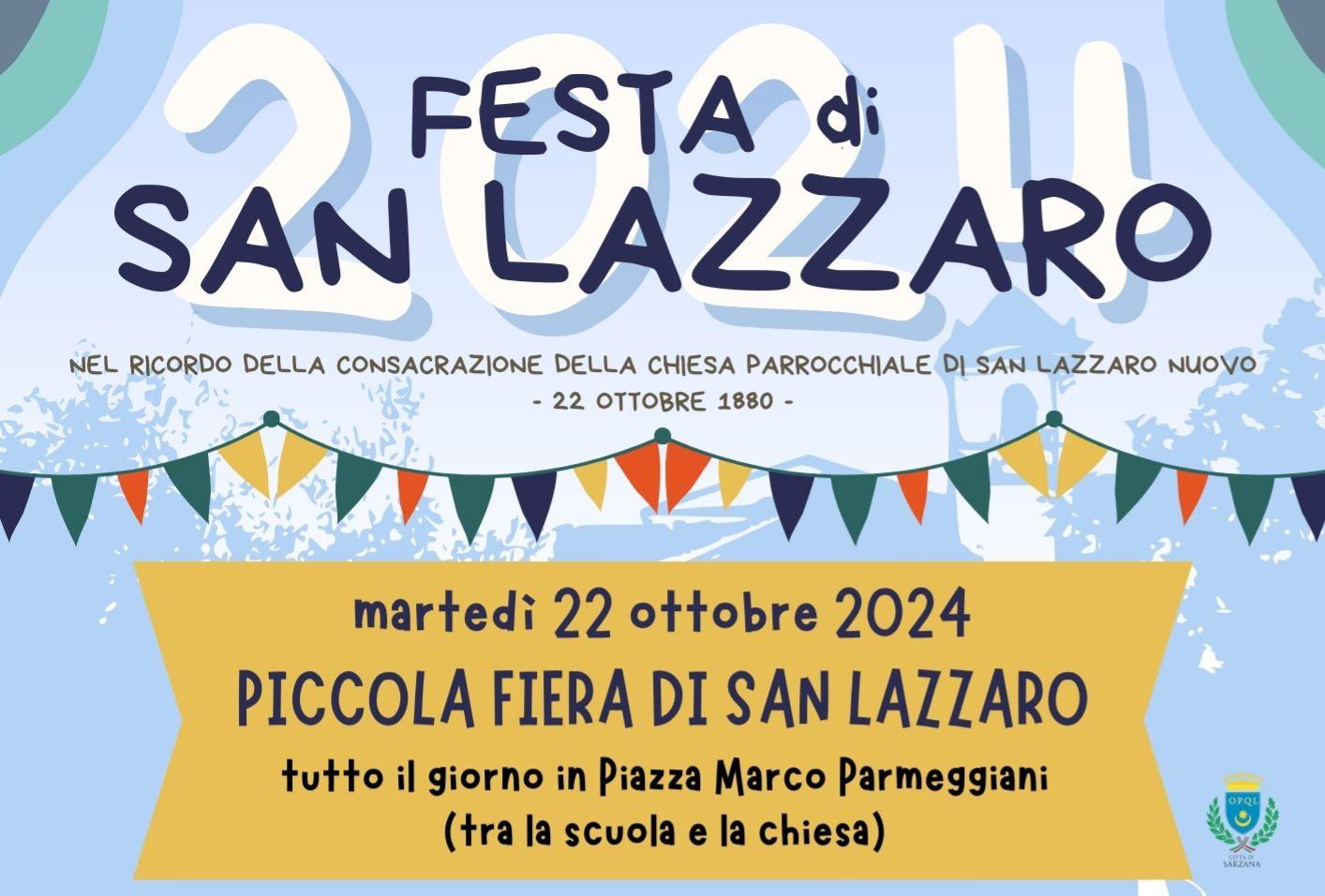 Nell’ambito dei festeggiamenti in onore al Santo patrono di San Lazzaro, nel 144° anniversario della consacrazione della chiesa parrocchiale (22 ottobre 1880), martedì 22 ottobre Piccola Fiera organizzata e allestita dal Comune di Sarzana nella Piazza Marco Parmeggiani (tra la chiesa e la scuola), nella Parrocchia è prevista anche la tradizionale Pesca di Beneficenza presso il salone parrocchia, a partire da sabato 19 ottobre sino a domenica 27 ottobre.
