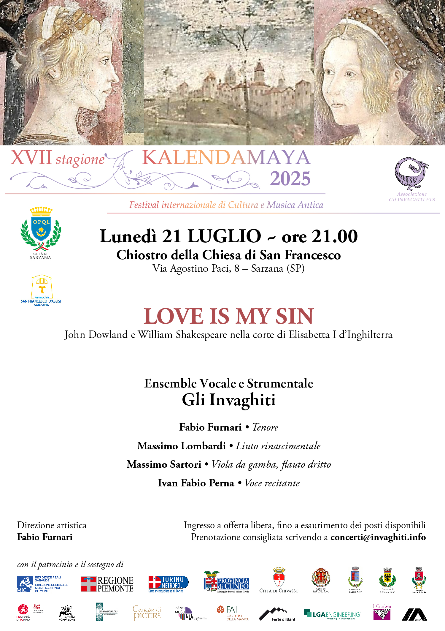 Nel cuore dell’estate sarzanese torna Kalendamaya, con un evento speciale nel suggestivo Chiostro di San Francesco. Lo spettacolo “Love is My Sin” è un omaggio all’epoca elisabettiana, dove le musiche di John Dowland e le parole di William Shakespeare si fondono in un viaggio di straordinaria bellezza artistica.