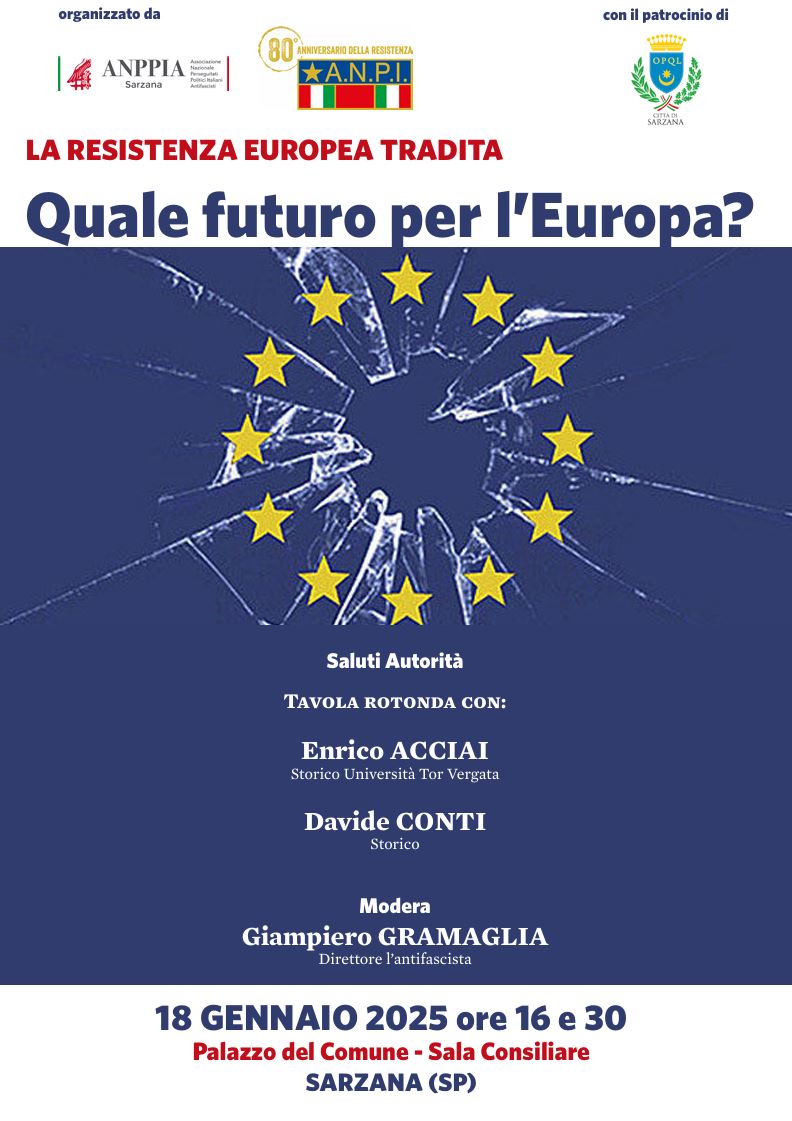 18 gennaio ore 16:30 Sala Consiliare. TAVOLA ROTONDA “La Resistenza europea tradita. Quale futuro per l’Europa?” Una riflessione sull’Europa del secondo dopoguerra, dalle sue radici antifasciste agli scenari presenti e futuri. Programma: