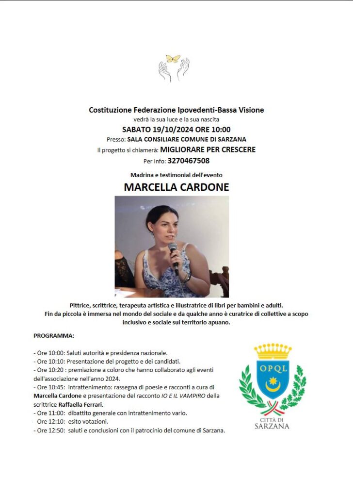 Sabato 19 ottobre ore 10:00 la Sala Consiliare del Comune di Sarzana ospiterà l’evento ” MIGLIORARE PER CRESCERE” . Madrina e testimonial dell’evento Marcella Cardone , pittrice, scrittrice, terapeuta artistica e illustratrice di libri per bambini e adulti, curatrice di collettive a scopo inclusivo e sociale sul territorio apuano. PROGRAMMA: – Ore 10:00: Saluti autorità e presidenza nazionale. – Ore 10:10: Presentazione del progetto e dei candidati. – Ore 10:20 : premiazione a coloro che hanno collaborato agli eventi dell’associazione nell’anno 2024. – Ore 10:45: intrattenimento: rassegna di poesie e racconti a cura di Marcella Cardone e presentazione del racconto IO E IL VAMPIRO della scrittrice Raffaella Ferrari. – Ore 11:00: dibattito generale con intrattenimento vario. – Ore 12:10: esito votazioni. – Ore 12:50: saluti e conclusioni con il patrocinio del comune di Sarzana. Per info: 3270467508. Organizzato da Federazione Ipovedenti-bassa Visione.