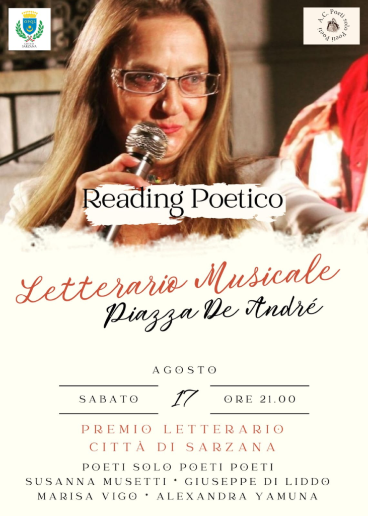17 agosto ore 21.00 Piazza De André avvincente percorso tematico che, attraverso un filo conduttore, legherà musica, canto, poesia, prosa, teatro, cinema, la voce, la parola, il pensiero e la pittura. Il protagonista sarà uno dei “luoghi dell’anima” che più influenza corpo e mente di ciascun essere umano: l’amore. Sul palco vibrerà la voce e il pensiero di molti Artisti che avvolgeranno il pubblico nel caleidoscopio di emozioni ora dolci, ora tormentate, di passioni e sogni gioiosi e travolgenti, ma anche pulsioni fosche, a dimostrazione dell’eterno scontro tra bene e male Susanna Musetti, presidente dell’ Associazione, condurrà la serata con ingresso gratuito al pubblico, percorrendo un ampio lasso temporale che dal secolo scorso arriverà ad oggi. Al suo fianco il vicepresidente e regista della diretta Giuseppe Di Liddo, Marisa Vigo, Alexandra Yamuna. Chitarra Massimo Azzarini