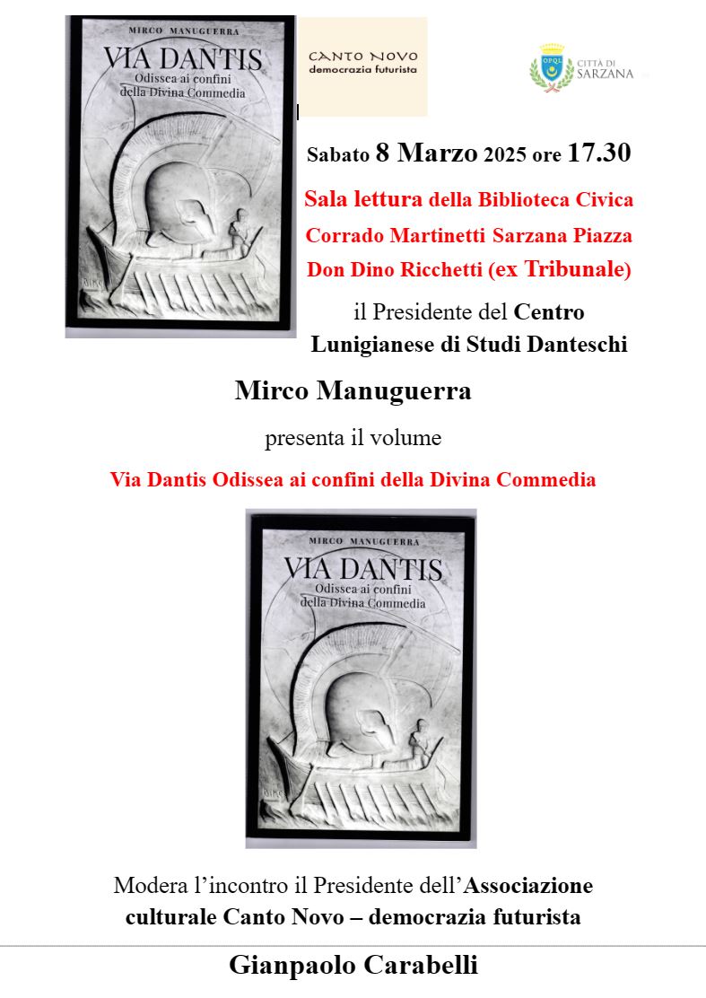 Sabato 8 marzo ore 17:30 Sala Lettura della Biblioteca civica Corrado Martinetti presso ex Tribunale, Piazza Ricchetti, il Presidente del Centro Lunigianese di Studi danteschi Mirco Manuguerra presenterà il volume “VIA DANTIS ODISSEA AI CONFINI DELLA DIVINA COMMEDIA” . Modera l’incontro il Presidente dell’Associazione culturale Canto Novo Democrazia Futurista Gianpaolo Carabelli.