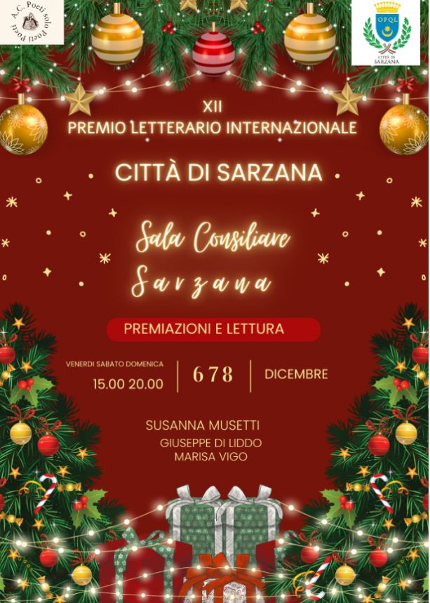 Da venerdì 6 a domenica 8 dicembre dalle 15 alle 20, Palazzo Civico ospiterà la XII Premiazione “Lettura, critica e analisi” nell’ambito del Premio Letterario Internazionale Città di Sarzana, con la partecipazione della cantante Alexandra Yamuna, interviste, riflessioni, pensieri di Susanna Musetti, Giuseppe Liddo, Marisa Vigo, che dialogheranno con gli autori.